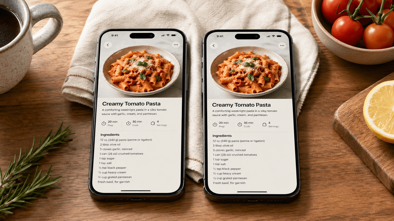 On first launch we sniff your locale (US → imperial+F, UK → metric+C, AU → metric+C, anything else → as authored) for sensible defaults. You can change any of them at any time and every recipe in the library re-renders immediately.